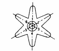 For a six arm horn, to shift the holes center line to the right (clockwise) relative to base line A, turn the arm counterclockwise and set arm 2 to the position of arm 1. The adjustable angle is 60° - (14.4° x 4) = 2.4°